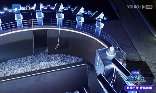 A performer climbs an inclined wall in the program Chase Me. Photo: Screenshot from Youku