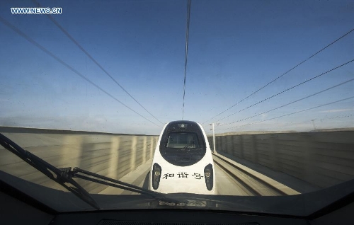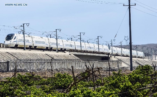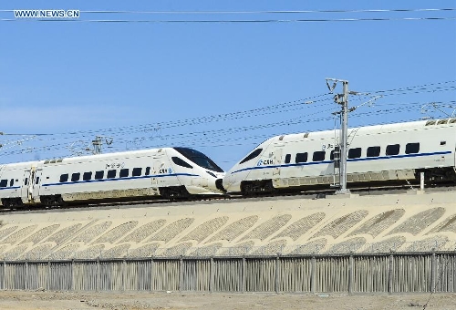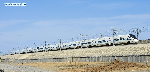 A CRH (China Railway High-Speed) train runs for a trial in Turpan, northwest China's Xinjiang Uygur Autonomous Region, June 10, 2014. The trial run for the first high-speed railway in Xinjiang Uygur Autonomous Region started on June 3, marking a countdown to formal operations by the end of the year. (Xinhua/Zhao Ge)