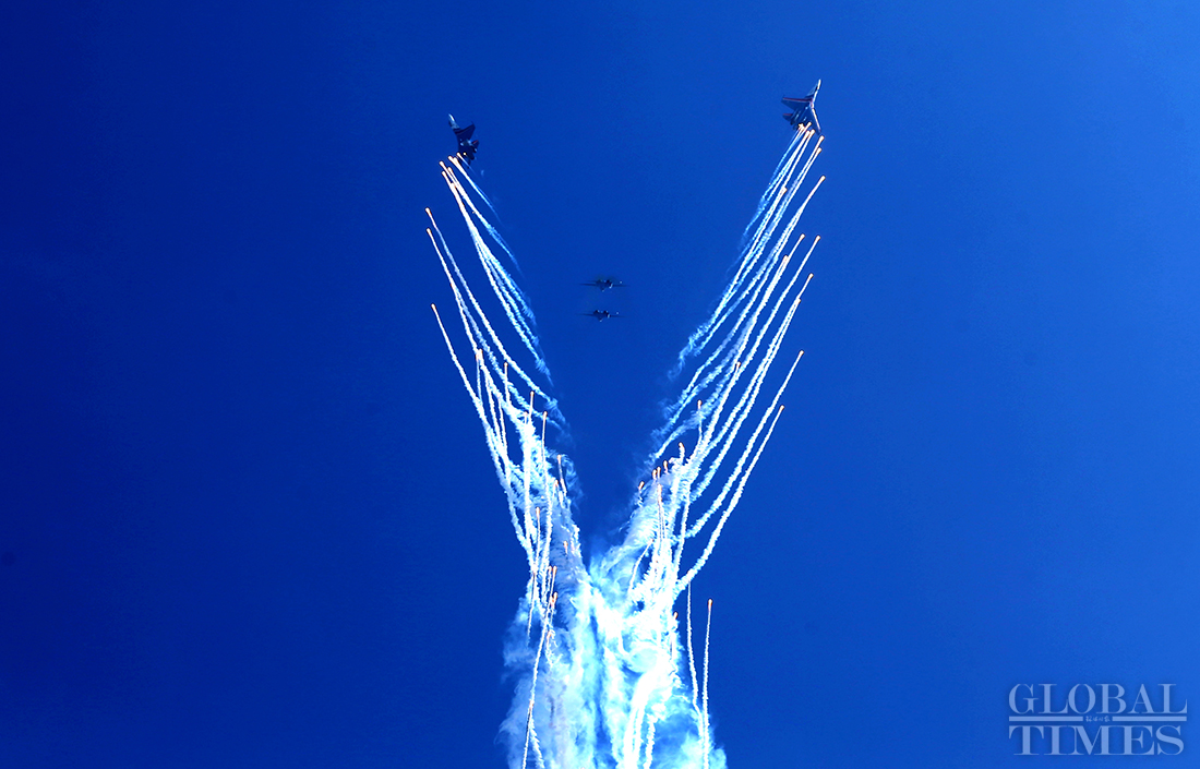 Russia’s Knight and Swift aerobatic teams fly in mixed formations at the 11th China International Aviation and Aerospace Exhibition in Zhuhai, South China's Guangdong Province, on Wednesday. Photo: Cui Meng/GT figcaption >