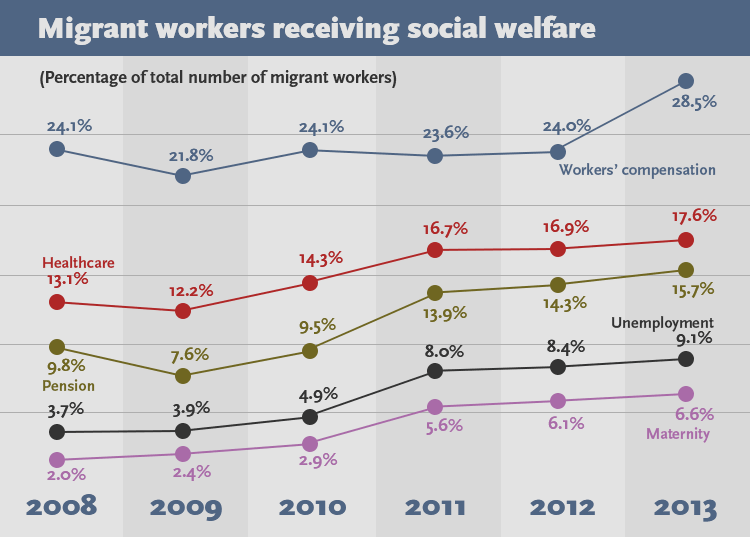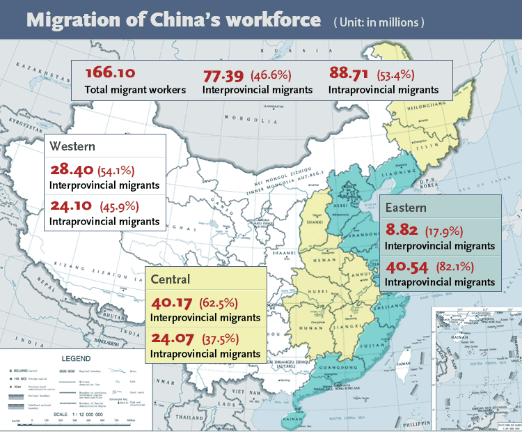 Migrant workers: The status of migrant workers is based in the household registration system, or hukou. The term mainly refers to rural residents that migrate to urban areas to pursue work in non-agricultural sectors for periods longer than six months. It is also used to define those working in places outside the place of residence indicated in their hukou.