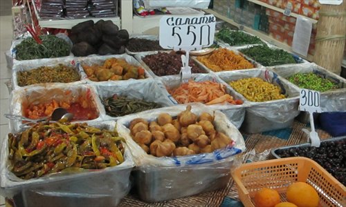 For Chinese longing for a taste of home, various pickled vegetables are displayed in a Chinese supermarket at the Yalian Trade Center in Almaty, Kazakhstan. Almaty is the largest city in Kazakhstan and an important stop along the Silk Road.