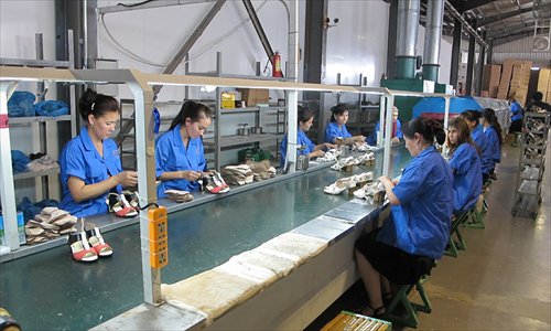Uzbek workers make shoes at a factory in the Peng Sheng Industrial Zone, Uzbekistan. Peng Sheng Industrial Zone is the largest privately-owned Chinese enterprise in Uzbekistan. The shoes will be sold to the Uzbek market.