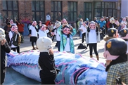 A total of 70 people wearing Chinese masks featuring the faces of traditional baby dolls marched through Beijing's 798 Art District with a giant toy Chinese sturgeon to raise public awareness about environmental protection on Saturday.