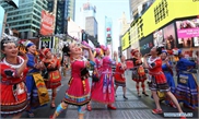 People wearing Chinese folk costumes sing Chinese folk song at Times Square of New York, the United States, on Aug. 10, 2019. (Xinhua/Zhang Fengguo)
