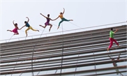 Members of the Vertical Dance Company BANDALOOP from the United States perform on the glass wall of an office building during the CAFe Budapest Contemporary Arts Festival in Budapest, Hungary, on Oct. 20, 2017.