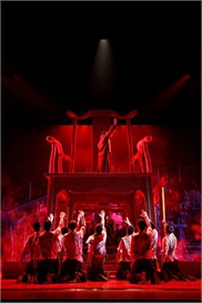 Red-clad dancers on the stage move like crazy to the ever quickening, heartbeat-like background music. Eventually they collapse from exhaustion except for one who continues to dance as if her body were beyond her control.