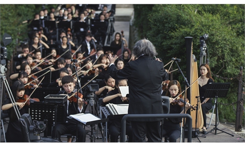 Heading out of the traditional music hall, the Xi'an Symphony Orchestra on Saturday overcame transportation and weather difficulties to hold an livestreaming concert on the peak of one of the Five Great Mountains of China.