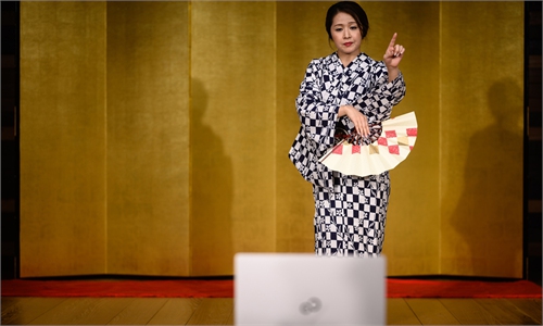 Japanese geisha "Chacha" sits on her knees with her fingertips neatly placed on the wooden floor, gracefully bowing to an audience sitting not in front of her but miles away, watching online.
