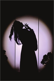She stands in front of us behind a white and plain Chinese screen on which her black shadow stands in the center of a big round circle of light, like a live action shadow puppet show. Dressed in traditional Chinese clothing, she holds a peony flower in one hand while she dances, then turns around and slides her other hand - fingers positioned to look like an orchid flower - along her chin.