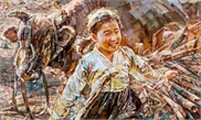 In a field full of straw, a little girl with a ponytail wearing a Korean-style dress looks into the distance, her smile like sunshine. Behind her, a cow is chewing on some food as it looks in the same direction with its cold eyes.
