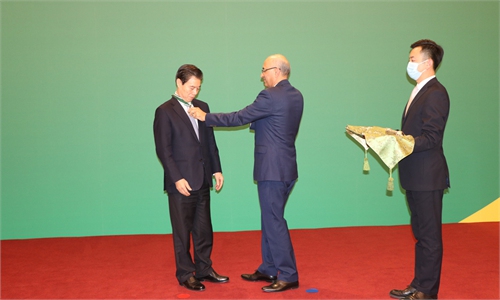Chinese Commerce Minister Zhong Shan was awarded the prestigious "Hilal-i-Pakistan" by Pakistan's top diplomat in China on behalf of Pakistani President Arif Alvi at the Diaoyutai State Guesthouse in Beijing on Thursday.