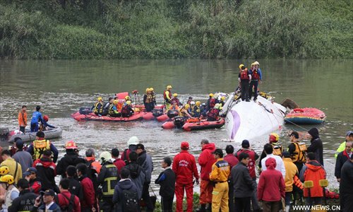 Rescuers and divers search for missing passengers at the crash site of the TransAsia ATR 72-600 turboprop plane in the Keelung river in New Taipei City on Friday. The plane crashed shortly after take-off from Taipei on Wednesday, hitting an elevated road as it banked steeply away from buildings and into the Keelung River. Photo: AFP