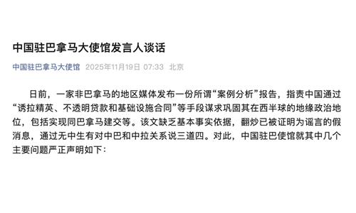 Recently, a regional media outlet outside Panama released a so-called "case analysis" report, accusing China of seeking to consolidate its geopolitical status in the Western Hemisphere through means such as luring elites, providing non-transparent loans and signing infrastructure contracts, including establishing diplomatic relations with Panama. This article lacks basic factual basis, rehashes false information that has already been proven to be rumors and wantonly makes unfounded remarks on China-Panama and China-Latin America relations, the spokesperson for the Chinese Embassy in Panama criticized in a statement published on Wednesday early morning.