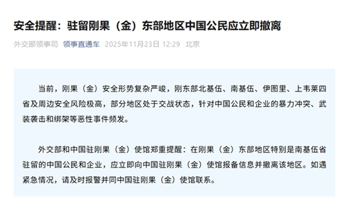 The Chinese Ministry of Foreign Affairs' official WeChat platform on Sunday released a safety notice advising Chinese nationals in eastern Democratic Republic of the Congo (DRC) to evacuate immediately, citing the highly complex and severe security situation in the region.