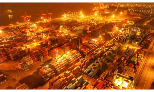 At the container terminal of Zhangjiagang Port Area in Suzhou Port, East China's Jiangsu Province, container trucks shuttle back and forth on March 5, 2026, presenting a scene of bustling activity. Photo: VCG