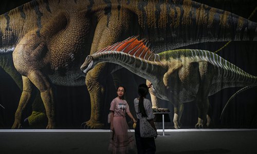 Models of dinosaurs are displayed on Friday in Guangzhou, South China's Guangdong Province. The exhibit, introduced by the American Museum of Natural History, reveals the biological mysteries of a group of super-large dinosaurs, sauropods with long necks and tails, and suggests how these giant animals thrived on Earth for about 140 million years. Photo: VCG