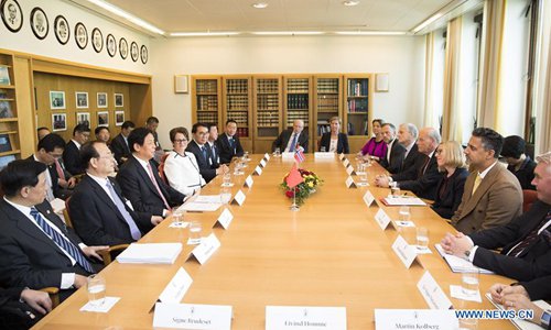 Li Zhanshu, chairman of the Standing Committee of the National People's Congress (NPC), meets with members of Norwegian parliament's standing committee on foreign affairs and defense in Oslo, Norway, May 15, 2019. China's top legislator Li Zhanshu paid an official friendly visit to Norway from May 15 to 18, expecting to promote the development of Sino-Norwegian ties to score more progress. (Photo: Xinhua)