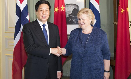 Li Zhanshu(L), chairman of the Standing Committee of the National People's Congress (NPC), meets with Norwegian Prime Minister Erna Solberg in Oslo, Norway, May 16, 2019. China's top legislator Li Zhanshu paid an official friendly visit to Norway from May 15 to 18, expecting to promote the development of Sino-Norwegian ties to score more progress. (Photo: Xinhua)
