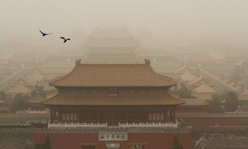 Tiananmen Square is covered in haze from a Beijing sandstorm in 2017. The sandstorm affected much of north China, including Beijing, with the capital's meteorological center issuing a blue alert Thursday morning. Photo: IC