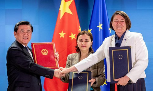 Representatives from China and the European Union shake hands after signing agreements on civil aviation cooperation in Brussels, Belgium, on May 20, 2019. China and the European Commission on Monday signed two milestone agreements on civil aviation, marking an important step to implement the consensuses reached by leaders from both sides during the China-EU Summit held last month. (Photo: Xinhua)