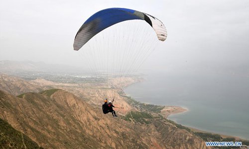 Tourists glide above the three gorges of the Yellow River in Yongjing County, northwest China's Gansu Province, May 19, 2019. The three gorges that consist of Bingling Gorge, Liujia Gorge and Yanguo Gorge are located at the upper reaches of the Yellow River, China's second largest river. (Photo: Xinhua)