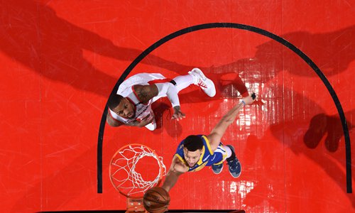 Stephen Curry of the Golden State Warriors goes to the basket against the Portland Trail Blazers on Monday in Portland. Photo: VCG