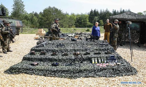 German Chancellor Angela Merkel (2nd R, Front) looks at equipment of NATO'S Very High Readiness Joint Task Force during her visit in Munster, Germany, on May 20, 2019. Merkel on Monday assured Germany's help for Ukraine to solve the conflicts in its Donbas region. She made the statement during her visit to a rapid reaction force of NATO in Germany's Munster. (Xinhua/Shan Yuqi)