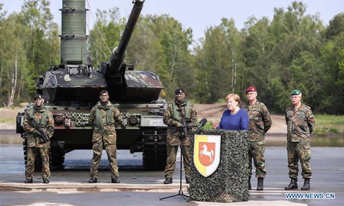 German Chancellor Angela Merkel (3rd R) delivers a speech after a training demonstration during her visit to NATO's Very High Readiness Joint Task Force (VJTF) in Munster, Germany, on May 20, 2019. Merkel on Monday assured Germany's help for Ukraine to solve the conflicts in its Donbas region. She made the statement during her visit to a rapid reaction force of NATO in Germany's Munster. (Xinhua/Shan Yuqi)