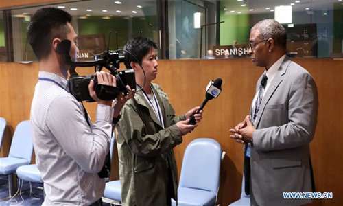 United Nations chief economist Elliott Harris (R) speaks during an interview with Xinhua at the UN headquarters in New York, May 17, 2019. The U.S.-China trade row augurs ill for global trade and economy and benefits nobody, said Elliott Harris. (Xinhua/Ma Jianguo)