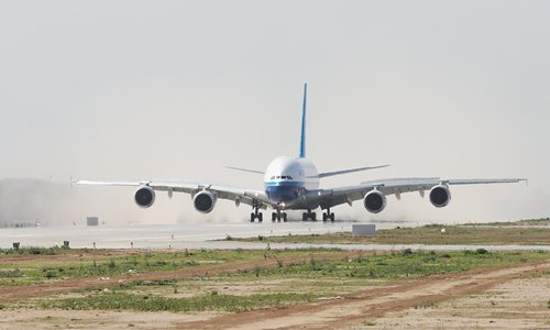 A passenger plane lands at the Beijing Daxing International Airport in a test flight on May 13. Photo: IC