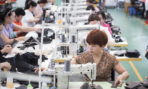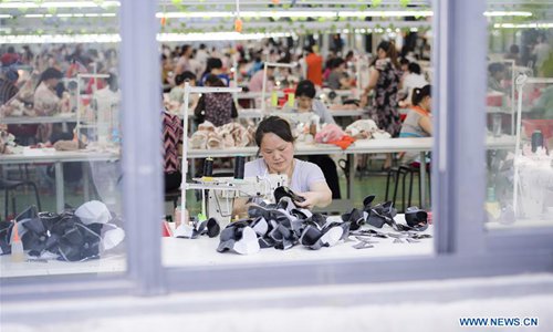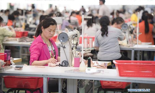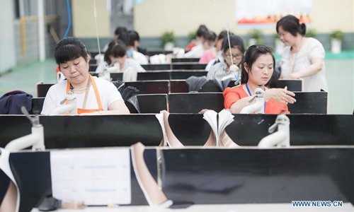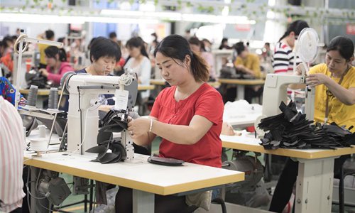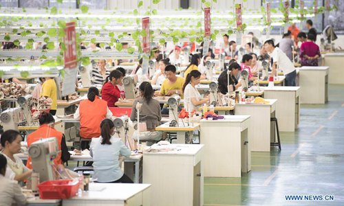 Villagers work at a poverty alleviation shoes making workshop at Guanyin Village in Yunxi County of Shiyan City, central China's Hubei Province, May 22, 2019. The mountainous Yunxi County encourages enterprises to establish poverty alleviation workshops in villages to help local residents get employed. (Photo: Xinhua)