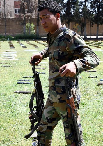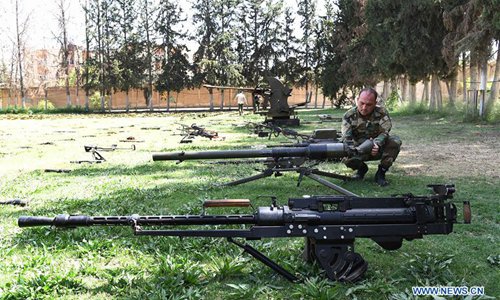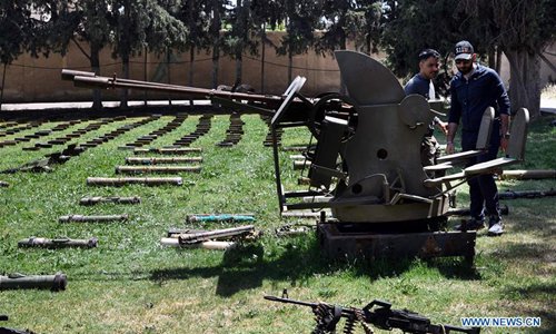 Syrian army showcases weapons found while combing formerly rebel-held areas in the countryside of the capital Damascus and the southern province of Daraa at a military base in Damascus on May 21, 2019. (Photo: Xinhua)