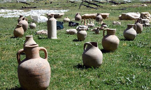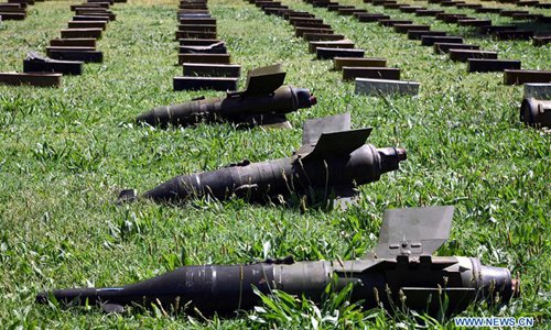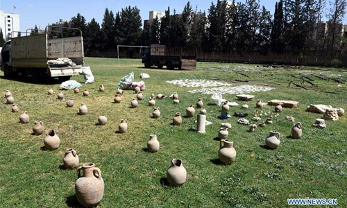 Syrian army showcases artifacts found while combing formerly rebel-held areas in the countryside of the capital Damascus and the southern province of Daraa at a military base in Damascus on May 21, 2019. (Photo: Xinhua)