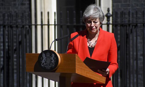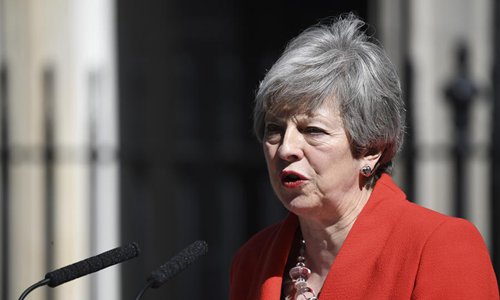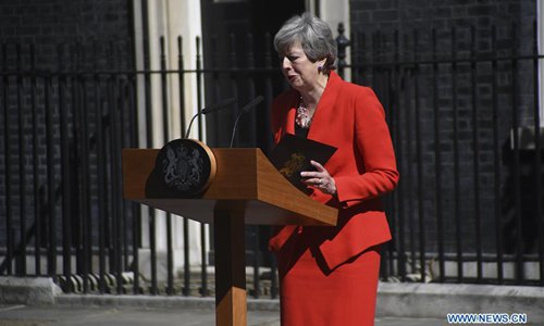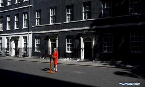 British Prime Minister Theresa May speaks to the media outside 10 Downing Street in London, Britain on May 24, 2019. Theresa May said on Friday that she will quit as leader of the Conservative party on June 7, paving the way for the process of electing her successor. (Xinhua/Alberto Pezzali)