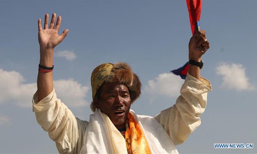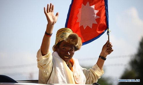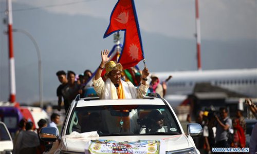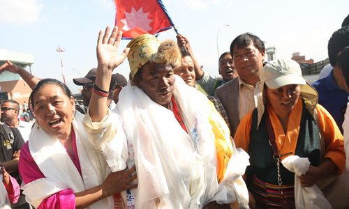 Nepali mountaineer Kami Rita Sherpa waves towards the media personnel upon his arrival after climbing Mount Qomolangma for a 24th time, creating a new record for the most summits of the world's highest mountain, in Kathmandu, Nepal May 25, 2019. (Xinhua/Sunil Sharma)