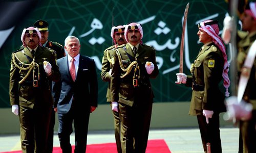 Jordan's King Abdullah II (C) reviews the Royal Guard of Honor during the ceremony of the 73rd anniversary of the Independence of Jordan in Amman, Jordan, May 25, 2019. (Xinhua/Mohammad Abu Ghosh)