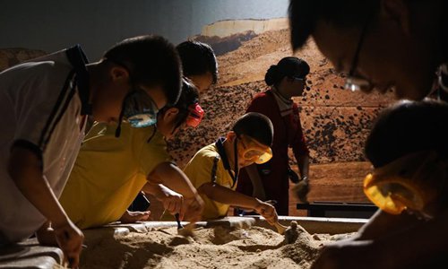 Visitors take part in an activity during an evening dinosaur exhibition held as part of the 2019 Guangzhou Science and Technology Week at Guangdong Science Center in Guangzhou, south China's Guangdong Province, May 24, 2019. (Xinhua/Liu Dawei)