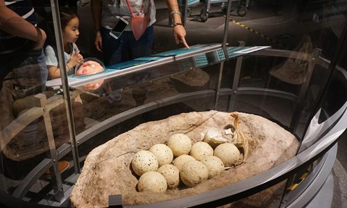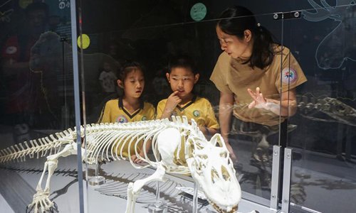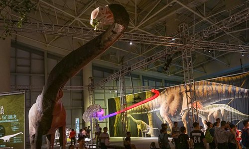 Visitors tour an evening dinosaur exhibition held as part of the 2019 Guangzhou Science and Technology Week at Guangdong Science Center in Guangzhou, south China's Guangdong Province, May 24, 2019. (Xinhua/Liu Dawei)