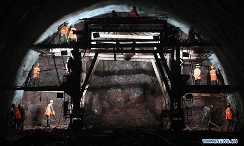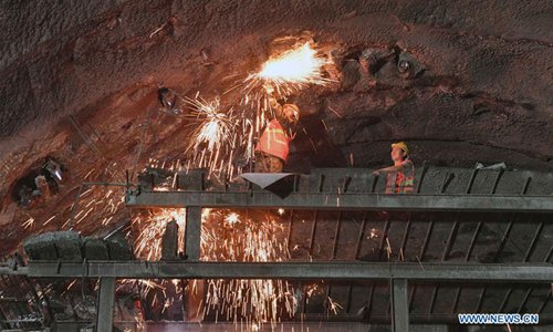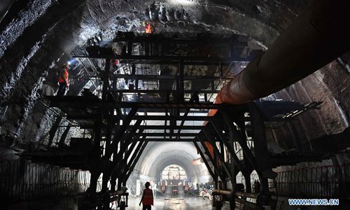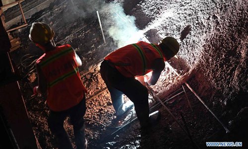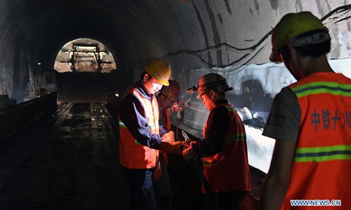 Constructors work at the construction site of Dajianshan railway tunnel of the Yuxi-Mohan Railway in southwest China's Yunnan Province, May 25, 2019. (Photo: Xinhua)
