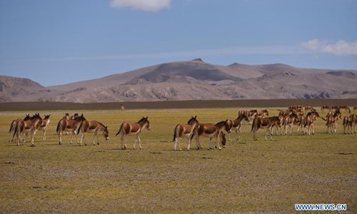 Photo taken on May 24, 2019 shows Tibetan wild donkeys in Shuanghu County of Nagqu, southwest China's Tibet Autonomous Region. (Photo: Xinhua)