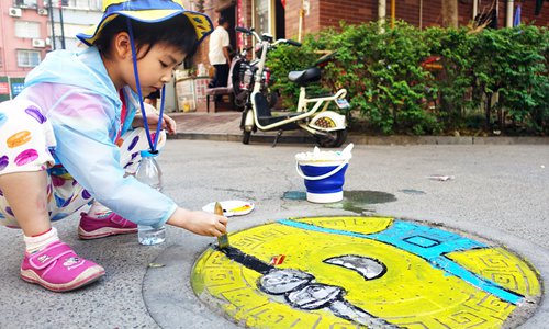 A child paints a manhole cover to help beautify the city of Luoyang in Central China's Henan Province on Saturday. Photo: VCG