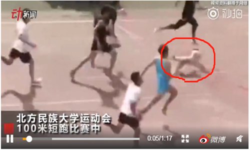 Xiaobai, the stray dog, runs after a student and finishes third for the 100-meter sprint on Thursday's sports meeting in North Minzu University in Yinchuan, Northwest China's Ningxia Hui Autonomous Region. Photo: Screenshot of a video by the Beijing News