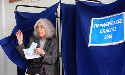 A woman votes at a polling station in Athens, Greece on May 26, 2019. Voters in Greece cast their ballots on Sunday in elections to the European Parliament (EP). (Xinhua/Marios Lolos)