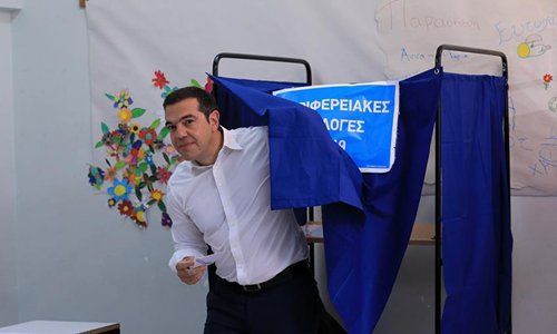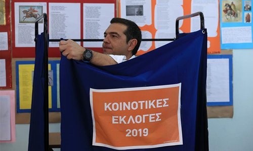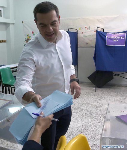 Greek Prime Minister Alexis Tsipras votes at a polling station in Athens, Greece on May 26, 2019. Voters in Greece cast their ballots on Sunday in elections to the European Parliament (EP). (Xinhua/Marios Lolos)