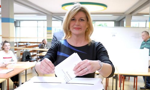 Croatian President Kolinda Grabar-Kitarovic casts her vote at a polling station in Zagreb, Croatia, May 26, 2019. The European Parliament elections started in Croatia on Sunday. (Xinhua/Patrik Macek)
