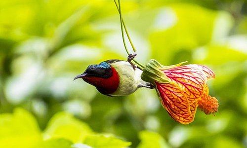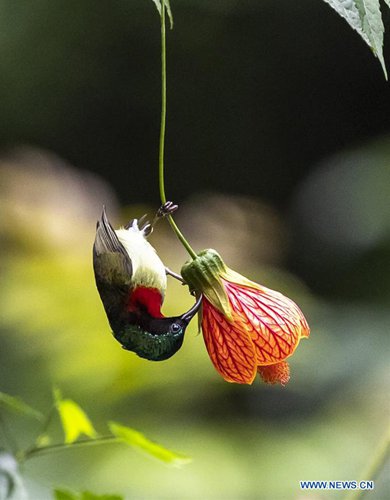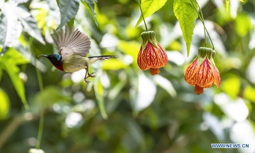 A fork-tailed sunbird flies among flowers at a scenic spot in Chongqing, southwest China, May 26, 2019. (Xinhua/Qu Mingbin)