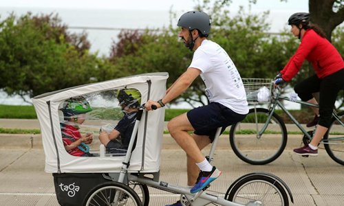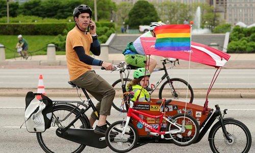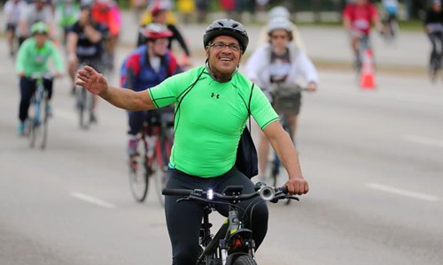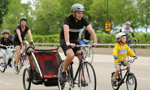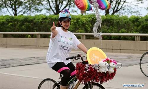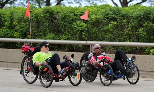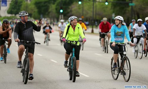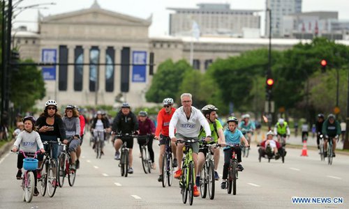 Cyclists participate in Bike the Drive on Lake Shore Drive in downtown Chicago, the United States, on May 26, 2019. Bike the Drive is a recreational, non-competitive bicycle ride held annually in Chicago. The Lake Shore Drive along Lake Michigan was closed half day on Sunday for the event with the participation of thousands of cyclists. (Xinhua/Wang Ping)