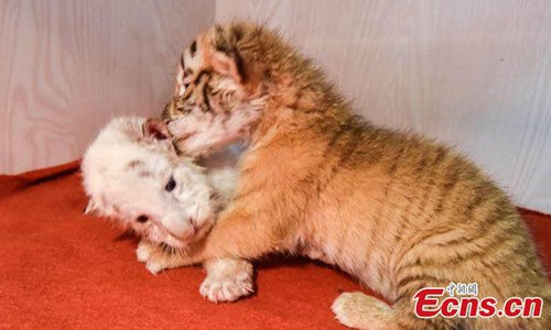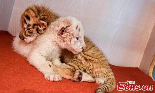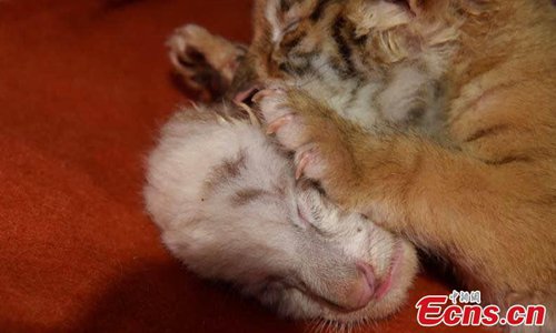 Twin tiger cubs celebrate their one-month anniversary at Hangzhou Safari Park in Hangzhou City, East China’s Zhejiang Province, May 26, 2019. The pair are considered rare as one is a golden tabby tiger and one a white tiger, both coloured versions of the Bengal Tiger subspecies. (Photo provided to China News Service)