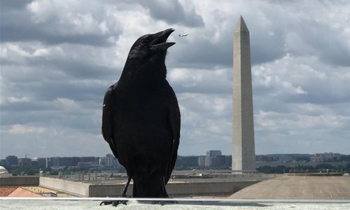 Photo taken with a mobile phone shows a bird resting on the top of a building near Washington Monument in Washington D.C., the United States, on May 27, 2019. (Xinhua/Liu Jie)