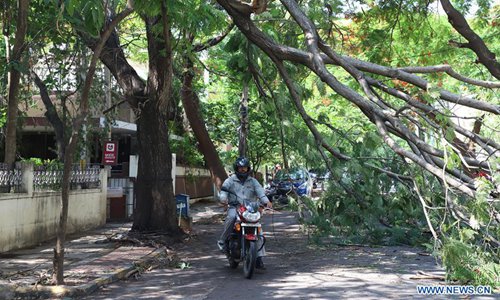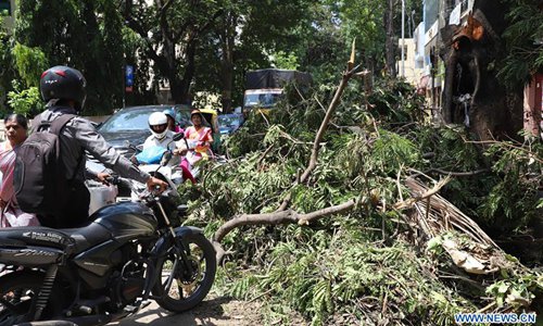 A fallen tree is seen in a street after the heavy rainfall and thunderstorms in Bangalore, India, on May 27, 2019. (Xinhua/Stringer)